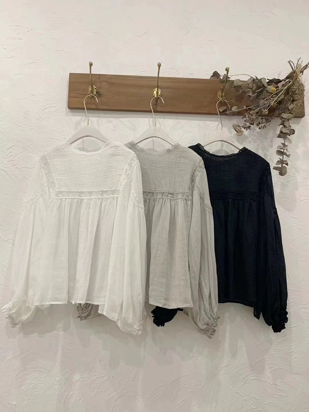 This is a very delicate and elegant blouse. Lots of pleated decoration on the front, and the sleeves are bishop style. It is highly recommend. White and black color available.