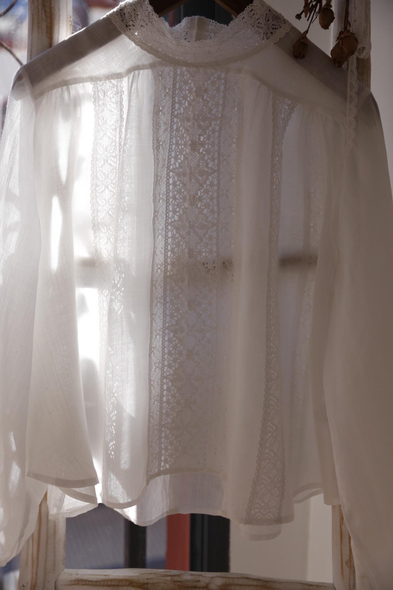 This blouse is made from natural ramie (linen) fabric, finished with delicate lace details for a soft vintage look.